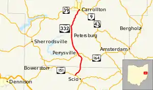 State Route 332 (SR 332) is a north–south state highway in the eastern portion of the U.S. state of Ohio. The highway's southern terminus is at a T-intersection with State Route 151 approximately 0.75 miles (1.21 km) northwest of the village limits of Scio. Its northern terminus is in downtown Carrollton at its junction with the triplex of State Route 9, State Route 39 and State Route 43.