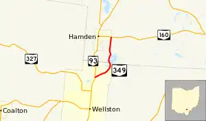 State Route 349 (SR 349) is a north–south state highway in south-central Ohio. SR 349 has its southern terminus is at SR 93 in Wellston. Its northern terminus is at SR 160 in Hamden. Besides providing a shortcut between SR 93 and SR 160 around Hamden, SR 349 allows access to Lake Alma State Park in Vinton County.