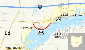 State Route 360 (SR 360) is a short east–west route in Buckeye Lake, Ohio. SR 360 starts and ends at SR 79, paralleled to the shore of Buckeye Lake. The route was designated in 1938, and has not changed significantly since.