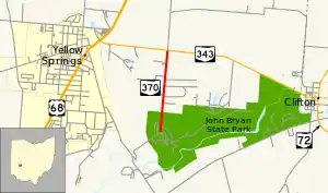 State Route 370 (SR 370) is 1.21-mile (1.95 km) long north–south state highway in the western part of the U.S. state of Ohio. The highway runs from its southern terminus at the main entrance to John Bryan State Park nearly two miles (3.2 km) southeast of Yellow Springs to its northern terminus at SR 343 about 0.75 miles (1.21 km) east of Yellow Springs.