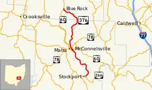 State Route 376 (SR 376) is a north–south state highway in the southeastern portion of the U.S. state of Ohio. SR 376 has its southern terminus at a T-intersection with SR 266 just across the Muskingum River from Stockport. Its northern terminus is at SR 60 in the unincorporated community of Blue Rock.