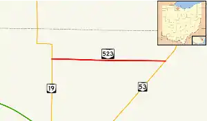 Ohio State Route 523 (OH 523) is a state highway in North Central Ohio. A short connector route, OH 523 links OH 19 at its western terminus with OH 53 at its eastern terminus. OH 523's intersection with OH 53 is located less than 4 miles (6.4 km) northeast of the OH 53 exit off of I-80/I-90/Ohio Turnpike.