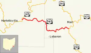 State Route 565 (SR 565) is a 6.98-mile-long (11.23 km) east–west state highway in the southeastern portion of the U.S. state of Ohio. The western terminus of SR 565 is at a T-intersection with SR 145 nearly 8 miles (13 km) northeast of the village of Lower Salem. Its eastern terminus is also at a T-intersection, this time at SR 260 approximately 7.25 miles (11.67 km) southwest of Graysville.