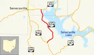 State Route 574 (SR 574) is a short state highway located around the southwest side of the Senecaville Lake in eastern Ohio. 4.36 miles (7.02 km) in length, it runs from SR 566 in Seneca Township, Noble County to SR 313 in Richland Township, Guernsey County just to the east of Senecaville. The route provides access to homes, recreational facilities, and the main dam in the vicinity of the lake.