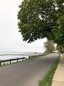 SR 575 is located in Erie County on the western portion of the island of, and within the village of, Kelleys Island in Lake Erie.[1] The route begins at the former Neuman's Ferry Dock,[4] where the first ferry that connected the island with Marblehead on the mainland was based. It follows West Lakeshore Drive heading northwest from that point. Lake Erie abuts the highway on the southwest side, while a number of residences appear on the northeast side. SR 575 curves to the north and then to the northeast as it passes the westernmost point of Kelleys Island. SR 575 then follows a sharp curve that takes it inland at a transition from West Lakeshore Drive onto Titus Road. For the majority of its remaining length, SR 575 travels in an east-northeasterly fashion, passing amidst heavy woods, and coming to an end where it meets Division Street at a T-intersection.[1][5] Some 790 vehicles use SR 575 on average each day.[6]