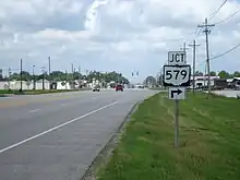 A signalized intersection with SR 51 in Lake Township just south of Northwood marks the starting point of SR 579. The route starts out in a northeasterly direction, but as it sweeps by the southeast corner of the former Woodville Mall, it turns due east, as it lines itself up with the boundary between Lake Township and the City of Northwood. SR 579, which starts out briefly as a five-lane road, quickly narrows down to two lanes, and enters into a more rural setting. Passing by a mix of generally flat open space and subdivisions, SR 579 intersects Bradner Road and Millbury Road on the way to its intersection with Fostoria Road, which marks the boundary between Wood and Ottawa Counties.[3]