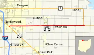 State Route 579 (SR 579) is an east–west state highway in northwestern Ohio, a U.S. state. The western terminus of SR 579 is at SR 51 just south of the city limits of Northwood. Its eastern terminus is at a T-intersection with SR 2 approximately four miles (6.4 km) to the east of Williston.