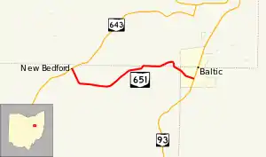 State Route 651 (SR 651) is a short state highway located in the vicinity of the tripoint of Coshocton, Holmes, and Tuscarawas Counties in Ohio. The route is 3.98 miles (6.41 km) long and is signed east–west. Its western terminus is at SR 643 in the unincorporated community of New Bedford (within Crawford Township) and its eastern terminus is at SR 93 in the village of Baltic.