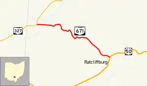State Route 671 (SR 671) is an east–west state highway in the southern portion of Ohio. Existing entirely within Vinton County, the western terminus of this short connector route is at SR 327 three miles (4.8 km) northeast of the hamlet of Londonderry. Its eastern terminus is at U.S. Route 50 (US 50) in the unincorporated community of Ratcliffburg.