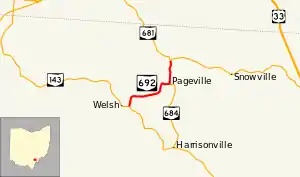 State Route 692 (SR 692) was a short north–south state route in southern Ohio that was located entirely within Meigs County. The southern terminus of SR 692 was at SR 143 approximately three miles (4.8 km) northwest of the hamlet of Harrisonville. Its northern terminus was at SR 681 near the hamlet of Pageville. In 2013, the Ohio Department of Transportation (ODOT) removed SR 692 from the state highway system by making the route north of Pageville an extension of SR 684 and the remainder being transferred to Meigs County's jurisdiction.