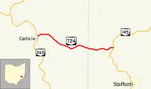 State Route 724 (SR 724) is a short east-west state highway situated in the southeastern portion of Ohio. The western terminus of this state route is at a T-intersection with State Route 260 nearly 6 miles (9.7 km) southwest of Summerfield in eastern Noble County, and its eastern terminus is at State Route 145 approximately 2 miles (3.2 km) northwest of Stafford in western Monroe County.