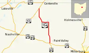 State Route 754 (SR 754) is a two-lane north–south state highway that runs within Holmes County, Ohio. The southern terminus of SR 754 is at the intersection that marks the eastern split of the concurrency of SR 39 and SR 60 approximately 5.5 miles (8.9 km) northwest of Millersburg. Its northern terminus is at SR 514 about 2 miles (3.2 km) southwest of Shreve.