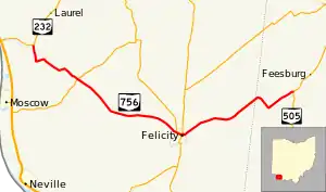 State Route 756 (SR 756) is a 13.16-mile-long (21.18 km) state highway in southwestern Ohio. Located in the southern portions of Clermont and Brown Counties, it runs from SR 232 in Monroe Township to SR 505 in Lewis Township. The east–west route passes through downtown Felicity.