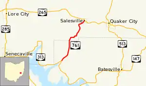 State Route 761 (SR 761) is a short state highway in the east-central portion of Ohio. The highway runs for 4.3 miles (6.9 km) from a T-intersection with SR 313 approximately four miles (6.4 km) southwest of Salesville to its junction with SR 265 in Salesville. This state route is also known as Kennonsburg Road for its entire length.
