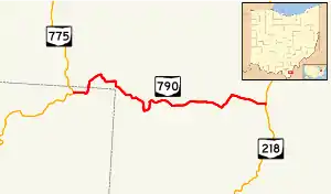 State Route 790 (SR 790) is an east–west state highway in southeastern Ohio, a U.S. state. Traversing the Wayne National Forest for its duration, SR 790's western terminus is at SR 775 in the unincorporated community of Lecta. Its eastern terminus is at SR 218 about 1 mile (1.6 km) north of the hamlet of Mercerville.