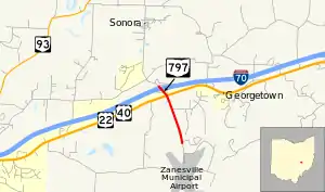 - ↑ "Roadway Description Inventory Report - DESTAPE (Muskingum County)" (PDF). Ohio Department of Transportation. July 3, 2014. p. 55-57. Retrieved September 6, 2014. SR 797 is not listed at all in the inventory; the intersection of Airport Road at US 22 on page 5 is listed as CR 796 (Airport Road) and CR 52 (Sonora Road).