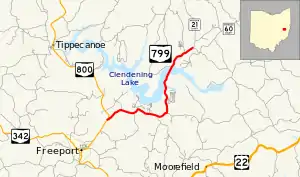 SR 799 begins at a T-intersection with SR 800 in Washington Township 1.25 miles (2.01 km) northeast of Freeport. From this point, passing first amidst some open fields before entering into a more forested terrain, with the occasional house appearing along the way, SR 799 roughly parallels the Clendening Lake shoreline about one-quarter mile (0.40 km) to the south, in the process entering Nottingham Township, dipping briefly into Moorefield Township before turning north, re-entering Nottingham Township, and then following Clendening Lake's eastern edge. SR 799 crosses small bays formed by the lake twice, and comes to an end at its intersection with CR 60 (Redeye Road) just past the lake's northernmost extent. The road continues another three miles (4.8 km) north to Deersville as CR 21 (Mallarnee Road).[6]