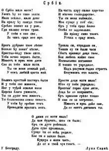 Oj Srbijo, mila mati (Serbian Cyrillic: Ој Србијо, мила мати), translated "O Serbia, Dear Mother",[1] is a Serbian patriotic song. It dates to the 19th century. Its first, longer version, Srbiji ("to Serbia") by poet Luka Sarić was published in 1860 in the literary magazine of Slovenka in Novi Sad.[2] In 1891, a Czech migrant to Serbia, Vojtěch Šístek, a member of the Singing Association Branko in Niš, composed the melody and the song quickly became very popular.[2] A very long song, with seven stanza with eight lines each, it was shortened in 1909 by another member of the Branko association, Dragomir Brzak, to four stanza with four lines each.[2] This version, with the name Oj Srbijo (O, Serbia) entered the school program prior to World War I.[2] It was very popular during the Balkan Wars and World War I, having entered the repertoire of the Royal Guard.[2] It was the opening song in a 24 June 1917 concert of the Serbian Royal Guard in Versaille.[2] During World War II, it was the unofficial anthem of the Serbian puppet Council of Ministers.[2] It has been theorized that the original writer, Luka Sarić, was a pseudonym, since no information has been found on him; it has been assumed that Prince Mihailo Obrenović was the writer, his 1861 song Što se bore misli moje having the same rhythm.[2]