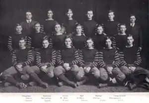 The first football game in the university's history was played on December 14, 1895, 12 years before Oklahoma became a state.[11] The team was organized by John A. Harts, a student from Winfield, Kansas.[12] Oklahoma was shut out 34–0 by a more experienced team from Oklahoma City in what was the Sooners' only game that season.[11][13] Oklahoma failed to record a first down throughout the entire game,[13] which was played on a field of low prairie grass just northwest of the current site of Holmberg Hall.[14] Several members of the Oklahoma team were injured, including Harts. By the end of the game, Oklahoma had borrowed members from the opposing squad so they would have a full lineup.[13] After that year, Harts left Oklahoma to become a gold prospector.[13]