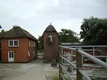 Markings | unpainted red brick tower with thatched roof |