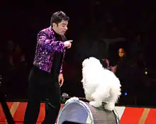 Richard Olate is a third-generation circus performer who grew up in Santiago, Chile.[1][2] The second youngest of 22 children, he grew up in poverty. As a young child, he found a stray dog in the street, adopted it, and began to teach it tricks. Soon he adopted two more dogs and trained them as well.[2] By age 12, he was supporting his family with a dog act, performing in schools and small circuses.[2][3] Richard's brother Jose joined the act and the duo caught the attention of circus promoters. In 1989, Richard and Jose Olate brought their act to the United States.[2] That year, the Chicago Tribune described their Circus Vargas performance as "clever and comical".[4]