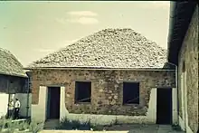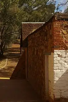 The stables opposite the gaol site were constructed in 1891 and remained in use until 1955. The present structure replaced a timber building erected on this site in 1860, which were destroyed by fire.[6] The present building is a single storey stone range with brick quoining and stone window dressings. It has a shallow pitched corrugated iron roof with gables. The façade facing the street is solid stonework with five small high level openings.[4]: 224–225 Restoration of the building began in the 1970s and the stables are currently open as part of the Old Gaol Museum complex.[7]