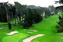 The three golf courses are named Lake, Ocean, and Cliffs. Lake and Ocean are 18-hole par-71 courses, and the Cliffs is a nine-hole par-3 course in the bluffs overlooking the Pacific Ocean. All three venues are lined with many trees and offer views of the Golden Gate Bridge and Golden Gate Park. The United States Golf Association recognizes the Olympic Club as one of the first 100 golf clubs established in the United States.