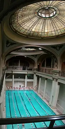 The Olympic Club's City Clubhouse is a masonry building on Post Street, two blocks west of Union Square in San Francisco, next door to the Bohemian Club and on the same block as the Marines Memorial Club. A garage (shared by the Marines Memorial Club) and separate entrance are on Sutter Street, on the north side of the block. The current clubhouse was built in 1912, after the first one was destroyed in the 1906 San Francisco earthquake. The clubhouse contains a pub, a dining room, meeting rooms, banquet rooms, guestrooms, a fitness center, a cardio solarium, handball and squash courts, circuit training facilities, two basketball courts, two swimming pools, and a rooftop deck.