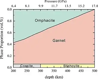 Omphacite is the dominated phase in the subducted oceanic crust in the Earth's upper mantle. The Mid-Ocean Ridge Basalt, which makes up oceanic crust, goes through ultrahigh-pressure metamorphic process and transforms to eclogite at depth ~60 km in the subduction zones.[9] The major mineral components of eclogite include omphacite, garnet and high-pressure silica phases (coesite and stishovite).[8] As depth increases, the omphacite in eclogite gradually transforms to majoritic garnet. Omphacite is stable up to 500 km depth in the Earth's interior.[8][10] Considering the cold geotherm of subducted slabs, omphacite can be stable even in deeper mantle.
