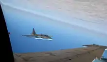 In 2016, Alexander Galkin, the Russia's Southern Military District commander, said Su-25s had flown more than 1,600 sorties and dropped around 6,000 bombs since the beginning of Russia's intervention in September 2015.[60] In September 2017, the Russian Ministry of Defence released a video showing two Su-25s helping to rescue Russian troops encircled by Tahrir al-Sham militants.[61] Two months later, a pair of Su-25s flying near Mayadin, in eastern Syria, was suddenly intercepted by a U.S. F-22 jet which abruptly entered the flight path of the two Russian warplanes and deployed flares and chaff in an attempt to cause the Su-25s to change their heading. The United States claimed the incident was not a provocation but a response to the Russian jets crossing the Euphrates River deconfliction line and not responding to radio calls.[62]