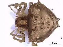 The adult female of Ordgarius sexspinosus has a body length of about 7–10 mm. The carapace is about 3.6–3.7 mm long.[2][3] It is dark brown and has six projections (tubercules). Two are arranged in the centre of the cephalic (head) part of the cephalothorax, the larger behind the smaller. Four are arranged in a transverse row in the thoracic part, two projecting forwards and two slightly behind projecting sideways. The legs are yellowish brown with brown rings. The first leg is the longest. The abdomen is usually longer (up to 6.9 mm[3]) than wide. The upper surface is grayish brown with complicated white patterns. The "shoulders" of the abdomen are humped. The epigyne has a distinct ring, and no scape.[2][4] The male has a body length of about 2 mm or less. The carapace is dark brown with black markings. The upper surface of the abdomen is also dark brown, with darker and lighter mottling. The underside of the abdomen is darker and has a pair of white spots. The embolus of the palpal bulb is spine-like.[3]