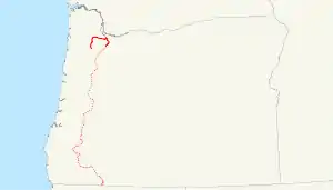 In order to secure funds for the entire road to California, Holladay reorganized the East Side Company as the Oregon and California Railroad, which would go on to complete the line to Roseburg in December 1872, and to the state line in December 1887. By that time, the Oregon Short Line Railroad had been completed as a branch of the First transcontinental railroad to Oregon.[5] The West Side Company operated its own road, under control of the O&C, until September 1879, when it was leased to the O&C-controlled Western Oregon Railroad, which had continued the line to Corvallis. Both companies were consolidated into the O&C in October 1880, and the Southern Pacific Company (SP) gained control in January 1887,[10] and leased the O&C in July.[7] Except south of Eugene, where the Natron Cutoff turned the old line into a secondary route that the SP sold to the Central Oregon and Pacific Railroad in December 1994, the Union Pacific Railroad (successor to the SP) still operates the East Side Company's line. The Portland and Western Railroad leased the remnants of the West Side Company's line in August 1995, and uses the stretch between Beaverton and Seghers (near Forest Grove) to reach the Stimson Lumber Company's sawmill.[11]