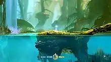 The designers say they were guided by works such as The Lion King and The Iron Giant and that it is a "coming-of-age story".[8] The designers were heavily influenced by the work of Hayao Miyazaki, particularly with one of the levels "Valley of the Wind", being a nod to Nausicaä of the Valley of the Wind.[11][12] The art style is meant to appear hand-drawn, similar to the more recent Rayman titles that utilize Ubisoft's UbiArt graphics engine; the game instead uses the Unity engine.[5][8] The game takes place in one large map, rendered at 1080p and 60 frames per second with no visible loading time as the player explores.[5][10] According to Mahler, the game's backgrounds are all individual components, with none duplicated as in other similar titles. As an example, Mahler explained, "You see this tree in the background and this mushroom and this rock? That's the one and only place you'll ever see those assets."[9]