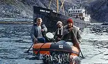 Sandy Hook was blown up and sunk during one scene. 30 kilograms (66 lb) of dynamite were placed on board, and the explosion and sinking were filmed with six cameras. Just after the fuse was lit and the crew were abandoning the ship, it was discovered that the Coastal Steamer was going to pass. To not wreck the scene, Borgli ran below deck and cut the fuse.[12] The scene in which Sandy Hook is attacked by the helicopter while in a narrow bay was filmed at Kjøllefjord, Finnmark. The helicopter used was Norwegian but painted in Russian Aeroflot livery. The helicopter was only available that day, but the captain on the vessel was drunk and refused to run it into the bay to film the scenes.[13]
