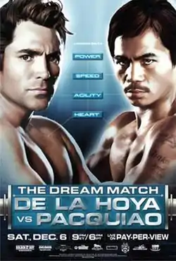 Oscar De La Hoya vs. Manny Pacquiao, also billed as The Dream Match, was a professional boxing welterweight superfight. The bout took place on December 6, 2008 at the MGM Grand Garden Arena, Las Vegas, Nevada, U.S. Pacquiao defeated De La Hoya via technical knockout when De La Hoya decided not to continue with the fight before the start of the ninth round. The card was a co-production of Bob Arum's Top Rank Boxing and De La Hoya's Golden Boy Promotions and was aired live on pay-per-view (PPV) on HBO PPV. The fight is notable for propelling Manny Pacquiao to full-blown superstar status in much of the western world (mostly in The United States), as Oscar De La Hoya symbolically "passed the torch", so to speak, to Pacquiao.