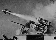 Södermanland testing its newly installed Sea Cat launcher sometime during 1963. The linked CRBFD used a variant of the M4 radar manufactured by Hollandse Signaalapparaten.[2]