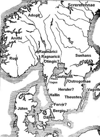 - ↑ It has even been suggested that Roduulf is the same king of that name who is known from other sources to have been king of the Danube Heruli until he was defeated by the Lombards some time between 494 and 508. Procopius and Paul the Deacon mention him, and Jordanes mentions a king of the Heruli in this period who was adopted as a son in arms by Theoderic, without naming him. Strikingly, Procopius mentions that some of the Heruli nobility migrated to Scandinavia after the defeat of Roduulf, and some of these later returned to the Balkan area (Gothic Wars, VI, 14–15), while in his Scandza list, Jordanes mentions that Heruli had lived near the Dani, like the Ostrogothae he mentions, but had been forced to leave.