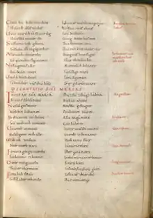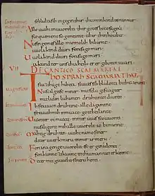 The Evangelienbuch was the work of an old man, and for most of his monastic life Otfrid was concerned with teaching and with the preparation of works in Latin, including biblical commentary, and glossaries to the gospels.[9] Otfrid's own hand has been identified in the manuscripts of five bible commentaries, Priscian's Institutiones Grammaticae, an anthology of Priscian with Latin and OHG glosses, parts of Augustine's Treatises on the Gospel of John.[10]