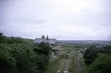 Camelford station (240m 56ch);[26] (Cornish: Reskammel) (50°38′20″N 4°41′14″W / 50.6389°N 4.6871°W / 50.6389; -4.6871 (Camelford station)) was situated more than 2 miles (3.2 km) from the town "at a road junction in wild country almost devoid of trees".[27] The station had a passing loop with the station building (including canopy) and signal box on the up platform. Like the waiting shelter on the down platform, the buildings were constructed from local stone. As elsewhere on the line, no footbridge was provided. Cattle pens were provided on the single siding, with the goods shed on a loop between the siding and headshunt.
