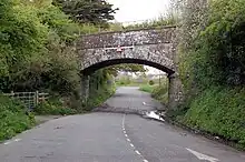 The bridge east of St Kew Highway which carried the line over the A39 road. This section of the road has been bypassed to avoid the low bridge