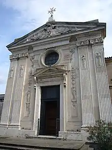 In 1760, the papal nephew and Grand Prior of the Knights, Cardinal Giovanni Battista Rezzonico, sought to improve the appearance of the buildings. On a limited budget, the church was substantially renovated between 1764-66 according to the designs of Giovanni Battista Piranesi. It is his only architectural work. According to a 2019 account, he "consolidated the structure of the 16th-century church and raised the side walls...restored the vault and designed the decoration for its new aspect".[3] Piranesi also designed the piazza in front of the church, the Piazza dei Cavaliere di Malta. The fairly low wall around the piazza is articulated by panels with paired obelisks with stelae positioned between them.