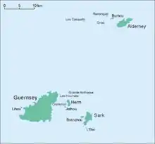 The Bailiwick of Guernsey – British Crown dependency located in the Channel Islands off the coast of Normandy.[1]