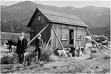 An obituary reveals that besides raising poultry and cows, Jason and Owen, through "selling their photographs", "received enough barely to survive".[6] At the time (1886–1889), to print a picture using ink onto paper or card stock was expensive, as it required a human engraver, but making photographic copies was much easier. There was then no amateur photography, the equipment and the processing were too expensive and cumbersome, but well-to-do travelers bought as souvenirs photographs of sights they saw, made available by local photographers. The Brown boys' cabins, with them and sometimes visitors outside, were photographed several times for this purpose, for souvenir pictures which the men sold. Their mountain cabins were only a mile from the house of Ruth Brown Thompson, their sister, and her husband, in Pasadena.[53]