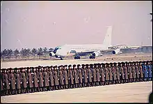 In April 2001, Gabonese Defense Minister and future President of Gabon Ali Bongo was invited to visit China. After reviewing the honor guard upon arrival, he proposed to his Chinese counterpart Chi Haotian, that members of the battalion will go to Gabon to help set up and train professional ceremonial units in the Gabonese Armed Forces. In March 2003, after just under three years, the Ministry of National Defense agreed to Bongo's request and sent four officers led by Lieutenant Colonel Wang Yuanjing to Libreville by the end of November of that year, after which they stayed to train Gabonese troops for more than 6 months. This marked the first time that any member of the PLA Guard of Honor had trained a foreign ceremonial unit.[17][18] It would later visit other countries such as the Democratic Republic of Congo, Rwanda, Mauritania and Qatar train their honor guards as well as active duty soldiers for parades. During the annual National Day parade in Qatar in 2017, the soldiers on parade adopted the Chinese marching style which was the result of the training by members of the battalion. Similarly, during the parade of the Rwanda Defence Force in honor of the 25th anniversary of the end of the Rwandan genocide, Chinese-trained RDF soldiers marched in a goosestep style for the first time as well as shouted commands in Mandarin to which the soldiers respond with "One! Two!", which is done similarly in the PLA honor guard.[19][20][21]