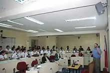 In July 2004, Mayor Lito Atienza spearheaded the development and implementation of the English Proficiency Program in all schools being funded by the city government. A committee on the use of English was formed a week after the directive was passed, headed by the PLM President Benjamin Tayabas. A few weeks later, the English as a Second Language (ESL) Center was established at the PLM[74] before the program's full implementation on September 1.[75] Initially, the city's campaign was derided by some critics and groups,[76][77] but later lauded and even followed by other institutions.[78][77][79] Two years after, the American Chamber of Commerce in the Philippines and the European Chamber of Commerce in the Philippines began taking part in a massive English retooling effort among private and government schools in partnership with the Department of Education.[80]