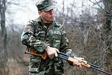 The PSL (Romanian: Puşcă Semiautomată 7,62 mm cu Lunetă, model 1974, "scoped semi-automatic rifle") is a Romanian designated marksman rifle. It is also called PSL-54C, Romak III, FPK and SSG-97 (Scharfschützengewehr 1997).[5] Though similar in appearance, mission and specifications[6] to the SVD Dragunov, the PSL rifle is mechanically completely different as it is based on the AKM assault rifle, with its internals simply being scaled up to accommodate the more powerful 7.62×54mmR cartridge.[7]