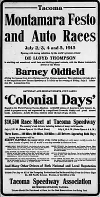 In 1912, a group of businessmen formed the Tacoma Carnival Association and created a 5-mile (8.0 km) dirt race course roughly bounded by today's Lakeview Avenue, Steilacoom Boulevard, Gravelly Lake Drive and S.W. 112th Street.[4] This course was reduced in size for each of the next two years and became the final 2-mile (3.2 km) layout in 1914. On July 4 of that year, over 35,000 spectators came out to see racing, Vaudeville acts and fireworks.[5] In 1915, the dirt track was upgraded to a wood track with turns banked up 18 feet (5.5 m), using 2 million board feet (4,720 m3) of lumber and 15 tons (14,000 kg) of nails.[1] At the time of construction, it was one of just eleven wood tracks in the United States.[1] Promoters claimed it would be one of the fastest race tracks, if not the fastest, in the nation.[6]