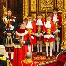 At Coronations, the peers who carry regalia in the procession (and others with particular roles in the service) are expected to have their own pages in attendance. These pages are directed to wear "the same pattern of clothes as the Pages of Honour wear, but of the Livery colour of the Lords they attend... [except that] ...the Royal liveries being scarlet and gold, the use of this combination of colours is restricted to the Pages of Honour, and in the case of a Peer whose colours are scarlet and gold, for scarlet some variant, such as murrey or claret, should be used."[3]