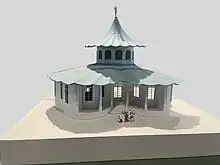 The pavillon du Trèfle, also known as the maison du Trèfle was constructed in 1739 by Emmanuel Héré de Corny. Inspired by Chinese pagoda architecture, this Chinoiserie pavilion was entirely made out of wood. It received its name "trèfle", meaning "clover leaf", due to its trefoil-layout. The silhouette of its roof was inspired by Chinese architecture. The building was made out a round salon with about seven metres in diameter, with a tiled floor. It was decorated with painted scenes with Chinese motifs and painted scagliola. It was furnished to be a comfortable place with a sleeping chamber with an alcove, a bathroom and a garde-robes. The upper floor was a belvedere lookout point where you could see the "bas bosquets", also called nouveaux bousquets,[16] created under Stanislaus, in between the river Vezouze and the canal.[16][14]