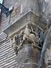 On the left side there are figures of stylized forms that narrate an episode of the Legend of Roland, specifically the scene of Roldan's fight against the giant Ferragut, trying to exemplify the struggle of good against evil. It is signed by Martinus of Logroño. On the right side, the decoration is formed by thin leaves of penca, Cistercian rooted.